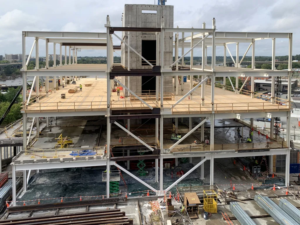 A new 1.4 million-sq.-ft development on the banks of the James River in Richmond, Virginia, is a six-acre campus with a 28-story steel frame office tower and a striking 121-ft-tall steel and timber hybrid amenity building. The amenity building, called Foundry South, is a campus hub that welcomes visitors with an assembly space and recruitment center. With goals to create a warmer and unique appearance for the heart of the headquarters, Foundry South was envisioned as a mass timber focal point with much of the structure exposed.